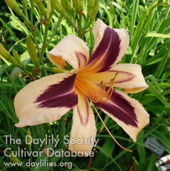 | Description : peach with dark purple eye above green yellow throat | |