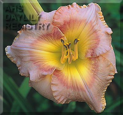 | Description : pink red with red eye and wire gold edge above green throat | |
