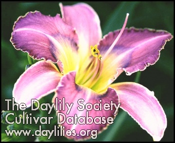 | Description : pastel pink blend with gold pleated rim edge above grass green throat | |