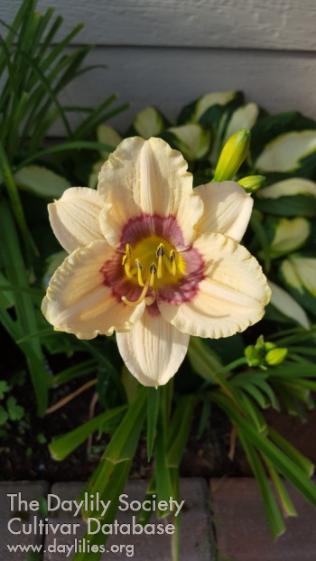 Description : cream pink with triple eyes of lavender mauve and charcoal above celery green throat