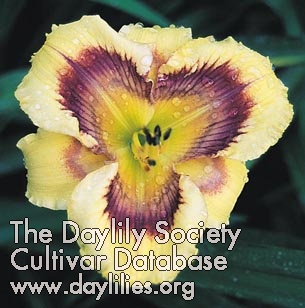 | Description : peach with violet eye and wire gold edge above green throat | |
