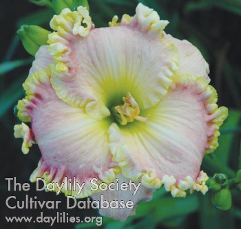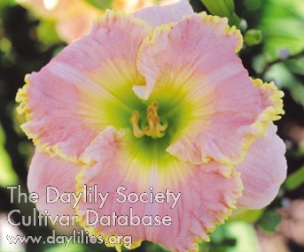 | Description : powder pink with yellow green edge above green throat | |