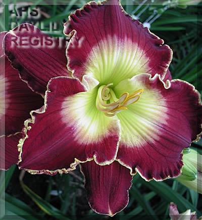 | Description : purple with lavender white watermark above intense green throat | |