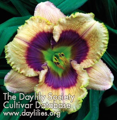 | Description : cream with a green throat and pattern lavender violet eye and matching picotee and gold edge | |