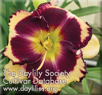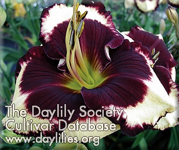 | Description : cream white with burgundy red eye and ruffled edge above yellow green throat | |