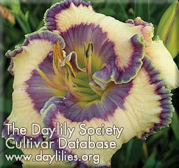 | Description : white with large violet eye and edge above yellow green throat | |