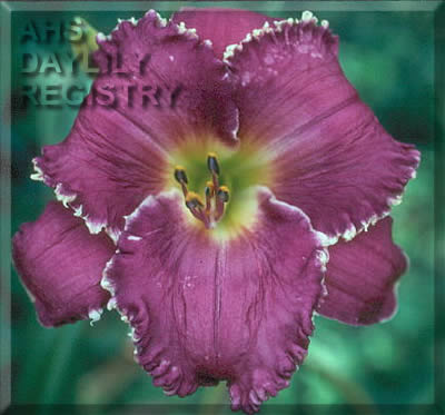 | Description : medium purple with blue purple eye and edge outlined with white teeth above green throat | |
