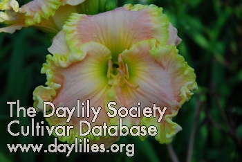| Description : silvery lavender with fine white toothy edging and watermark above green throat | |