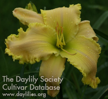 | Description : rose red with lighter cream rose watermark, yellow gold edge, end of petals have tentacles, green throat | |