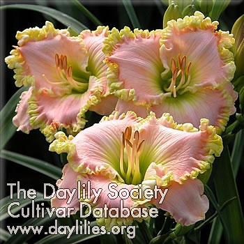 | Description : baby pink with a touch of lilac with an enormous ruffled chartreuse edge and throat | |