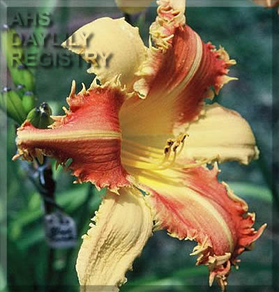 | Description : bitone with burgundy petals and cream brushed burgundy sepals, gold spiked edge, with a green throat | |