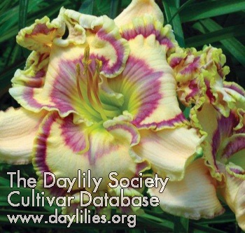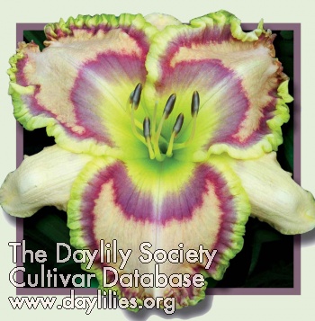 Description : ivory with a violet pattern eye and picotee, a green throat and gold edge