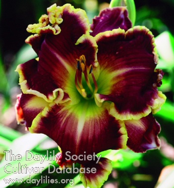 Description : black purple self with white edging above green throat