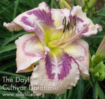 | Description : complex eye, violet with multiple white "birds," black veins, near white petaloids, lime green throat | |