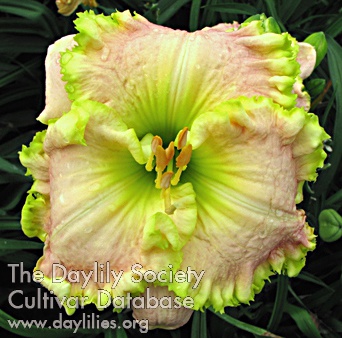 | Description : purple self with chartreuse green ruffled edging above large green throat | |