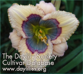 | Description : white base with true blue eye edged in raspberry above green throat | |