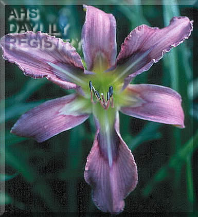 | Description : pale lavender pink open form, throat and eye range from, green to yellow to sky blue to blue violet to mulberry, feathered veining, lighter midribs, pattern on the sepals, outer petal edge is blue violet and white, teeth in warmer weather | |