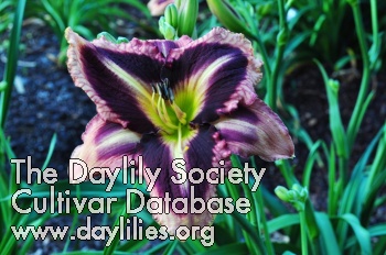 | Description : Light raspberry purple with dark magenta eye above a very large green throat that extends to the sepals, flat face. | |