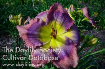| Description : Dark purple petals and sepals with large patterned eyezone on both petals and sepals of dark raspberry, blueberry purple and lighter purple rings, large ribbed green throat, and a double edge of blueberry and silver. | |