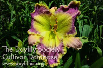 | Description : Rich purple with large silver watermark, infused with glowing green extended throat, bubbly silver edging, and white stripes on sepal edges. | |