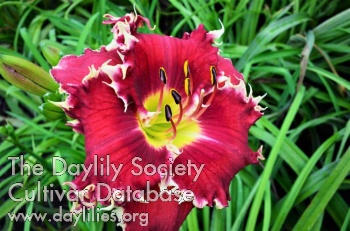 | Description : Red with darker red eye with green throat, large white teeth on petals and sepals. | |