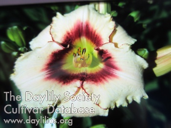 | Description : cream lavender with purple and gold picotee edges and purple eyezone above chartreuse throat | |
