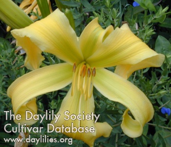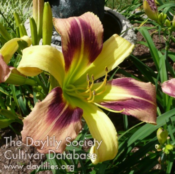 | Description : lavender petaled bicolor with cream orange blend sepals, red chevron on petals, green to yellow throat, recurved | |