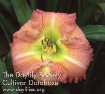 | Description : dark orchid lavender with variegated blue powder shading and green throat | |