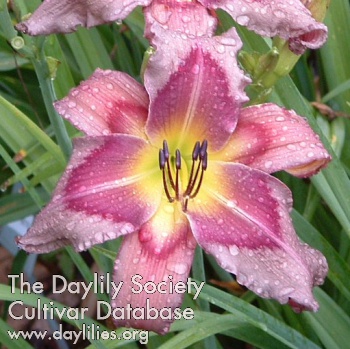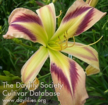 | Description : violet mauve semi-spider with dark purple eyezone and green chartreuse throat | |