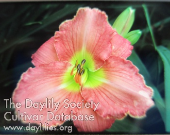 | Description : rose pink self with gold edge and deep forest green throat | |