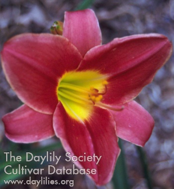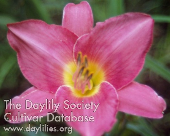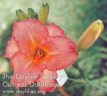 | Description : medium coral pink edged yellow, yellow halo above chartreuse throat | |