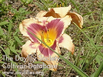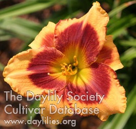 | Description : coral plum with purple plum eye above yellow throat | |