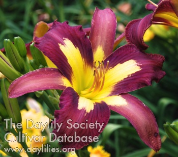| Description : lavender with chartreuse watermark above chartreuse yellow appliquéd throat | |
