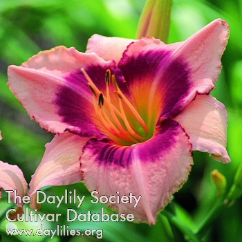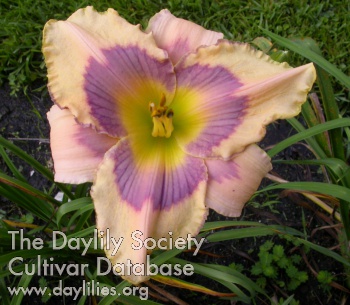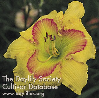 | Description : pineapple yellow with shaded eye pattern of lavender and mulberry rings outlined in red violet above green throat | |