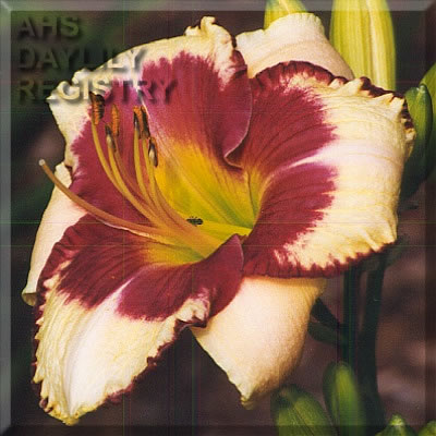 Description : cream yellow with purple eyezone and picotee above green throat