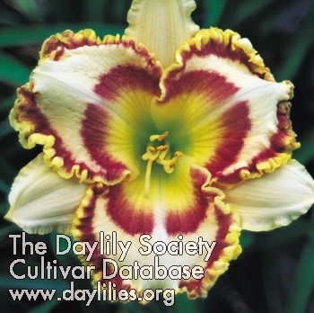 | Description : light soft yellow with medium yellow ruffled edge above green throat | |