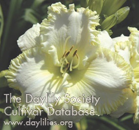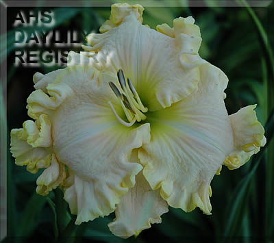 | Description : white with light tint of pink, diamond dusted, lime ruffled edge with lime to green throat | |