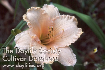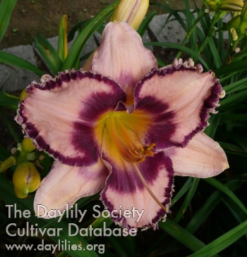 | Description : pink with blue mauve and gray blue double halo, fine mauve edge, second edge picotee gold, lime heart above a green throat | |