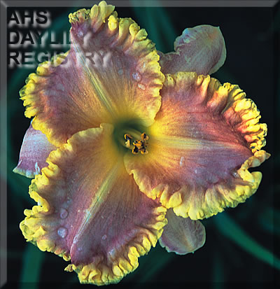 | Description : pink bitone gold edge finely ruffled the sepals are a very pale ponk, lime chartreuse to green throat | |