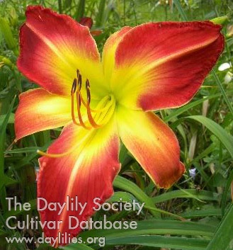 | Description : Burgundy with velvet texture, slightly ruffled, narrow gold edge on petals and sepals, green throat, fertile. | |