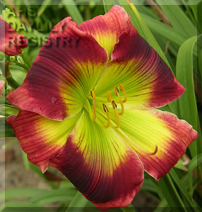 | Description : light orchid base with bold, dark purple ribbed eye, matching edge in dark purple outlined in gold and white ruffles above green throat | |