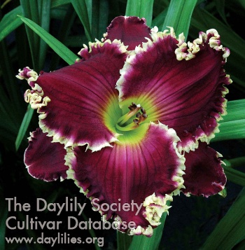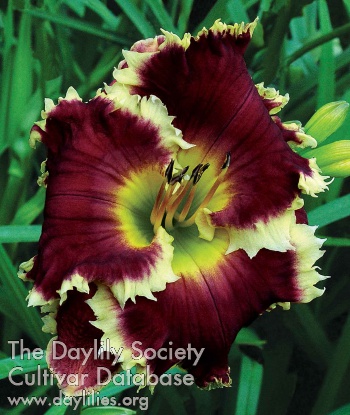 | Description : violet red bitone with a large watermark above a green throat, petal edges are surrounded by long protruding shark's teeth | |