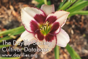 | Description : cream edged wine with ivory border and wine eyezone above green yellow throat | |