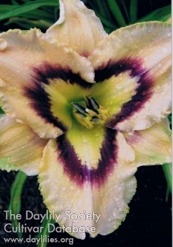 | Description : peach with patterned eye and small yellow tooth edge above yellow throat | |