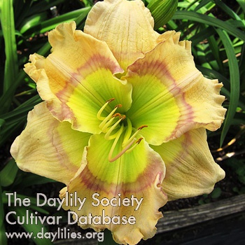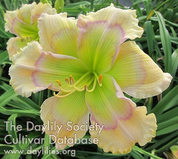 | Description : Very large, heavily ribbed yellow green throat extends onto face of petals and sepals, double purple and lavender ruffled edge with purple picotee, with pink on petal tips. | |