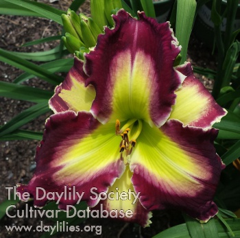 | Description : Purple with feathered, pink patterned watermark and a very green throat. | |