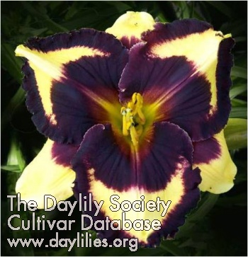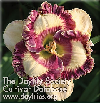 | Description : very round, bright violet blue eye and heavily ruffled edge with a near white background | |