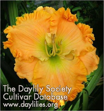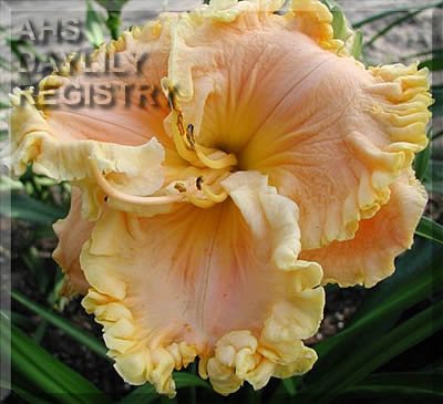 | Description : light peach with green throat and heavy ruffles, heavy substance | |
