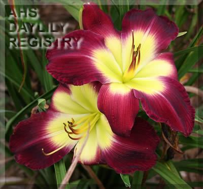 | Description : purple with lighter eyezone, white edge, and green throat | |