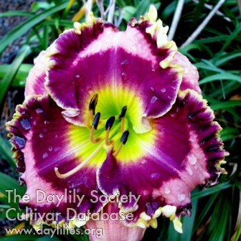 | Description : two tone raspberry cherry eye, double edge of raspberry and serrated gold ruffles, with a green throat | |